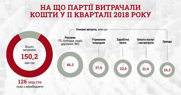 За квітень-червень парламентські політичні партії сукупно витратили 150,2 млн грн, із яких 46,3 млн пішли на рекламу.