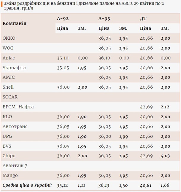 Станції компанії Укрнафта (552 АЗС), частина якої належить групі Приват, також підвищили ціни. Бензин марки А-92 подорожчав до 35,05 грн/л, А-95 – до 36,05 грн/л і ДП – до 40,66 грн/л. Водночас більша частина АЗС цієї групи підвищила ціни на пальне ще 27 квітня.