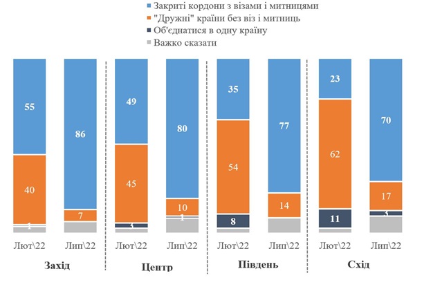 У регіональному розрізі переважна більшість (від 86% на заході до 70% на сході) вважає, що між Україною та Росією мають бути закриті кордони з візами та митницями.
