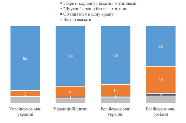 Навіть серед російськомовних українців 52% виступають за закриті кордони, і лише 3% стверджують, що Україні та Росії слід об’єднатися в одну державу.