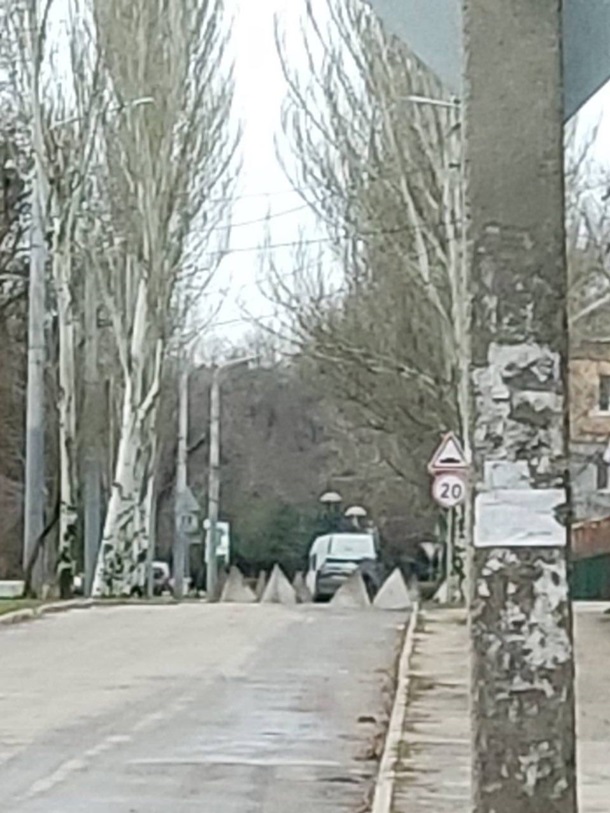 Вже другий день російські військові в центрі міста готують лінію оборони, розставляючи бетонні “зуби дракона”.